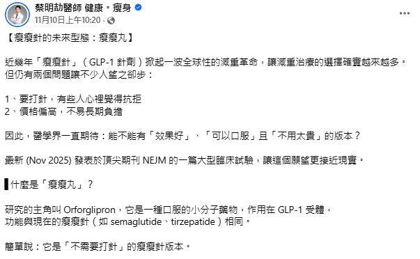 蔡明劼醫師分享(Nov 2025) 發表於頂尖期刊NEJM的一篇大型臨床試驗,研究主角「Orforglipron」為口服小分子藥物,作用與瘦瘦針(如semaglutide、tirzepatide)相同,意即「不需打針的瘦瘦針版本」。