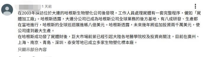 老北京茶館PO出人體加工產業鏈的影片之後,有人在留言區指出,2003年採訪位於中國大連的哈根斯生物塑化公司,工作人員處理屍體有一套完整程序,哈根斯成功發了屍體財後,巨大市場前景已經引起大陸各地醫學院校及投資商關注,目前在廣州、上海、南京、青島、深圳、泰安等地已成立多家生物塑化標本廠。