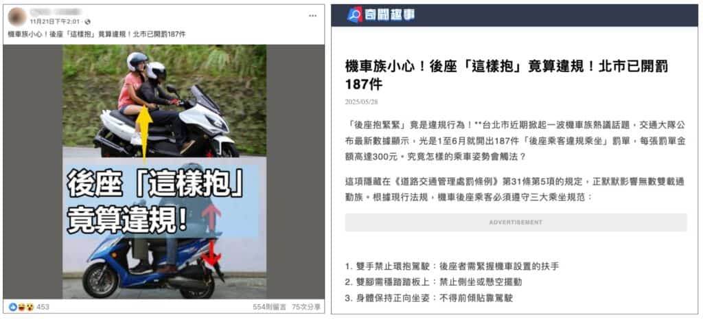 事實查核中心提醒,後座乘客只要正坐、不側坐,並戴上安全帽,就已符合現行規範,不論天冷、緊張或抓不穩而抱住駕駛,都不會構成違法,網路上流傳的「300元罰單」與「187件紀錄」純屬杜撰,民眾不必恐慌。