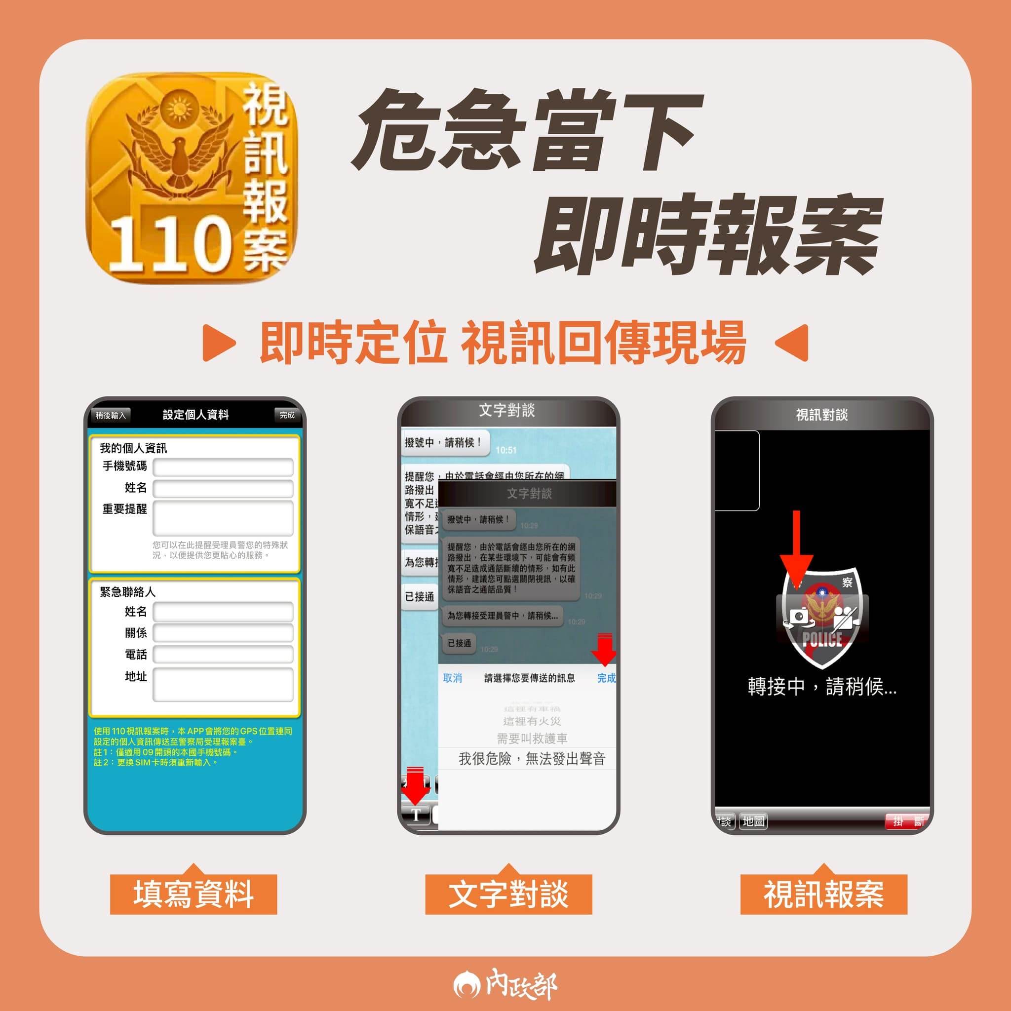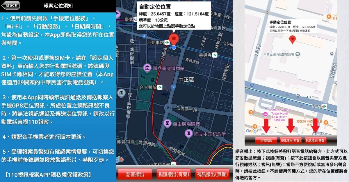 - 狠:可以「錄音錄影回傳」、「視訊通話」,甚至進行「無聲報案」(文字或簡訊報案),提供多種報案模式。
