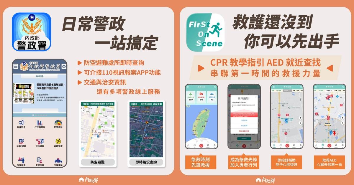 此外,內政部也提供另2款實用的「警政服務」與「急救先鋒」APP,呼籲大家平時先準備好防範,危險時刻才不會慌亂,防災安全不靠運氣而是靠準備:「現在就下載,也提醒身邊的人一起準備」,把握爭取更多存活時間: