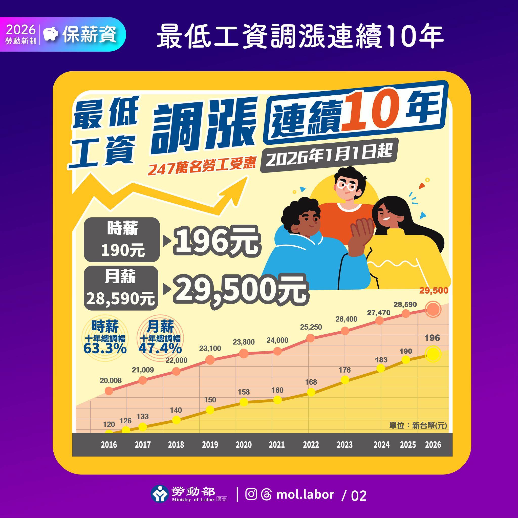 2026年元旦起,最低工資再度調升,月薪從28,590元提高至29,500元,時薪同步調整為196元,創下連續10年調漲紀錄,勞動部估計,至少約300萬名勞工將直接受惠。隨著基本工資上調,勞保、勞退與職災保險的投保級距也同步修正,最低投保薪資一併調升,讓勞工未來退休與保障基礎更穩固。