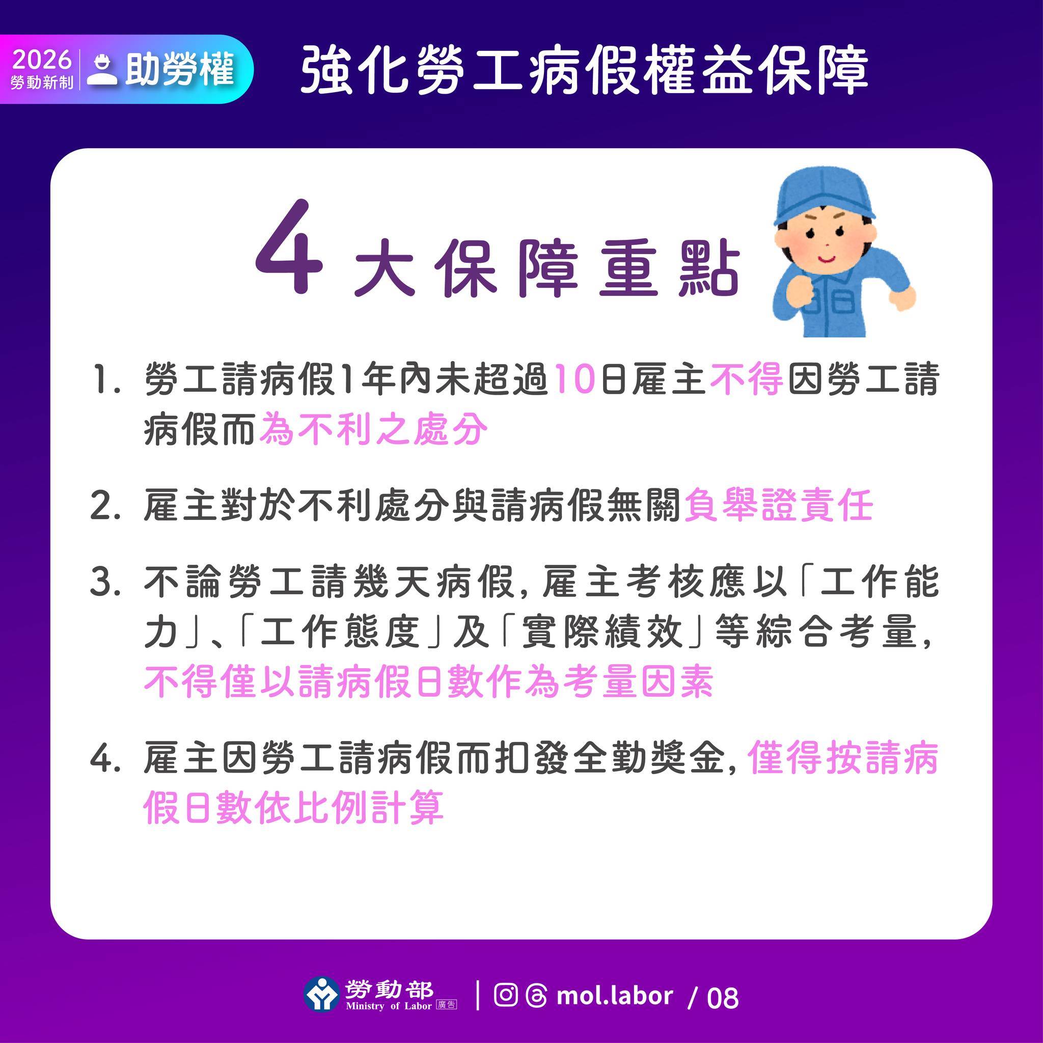 因空服員抱病上工事件引發社會關注,勞動部修正《勞工請假規則》,2026年起,勞工一年內請病假未超過10天,雇主不得解僱、降調、減薪或影響考績。若發生爭議,舉證責任將由雇主承擔,全勤獎金也只能「按比例扣」,不能一刀全砍,違規最高可罰100萬元。