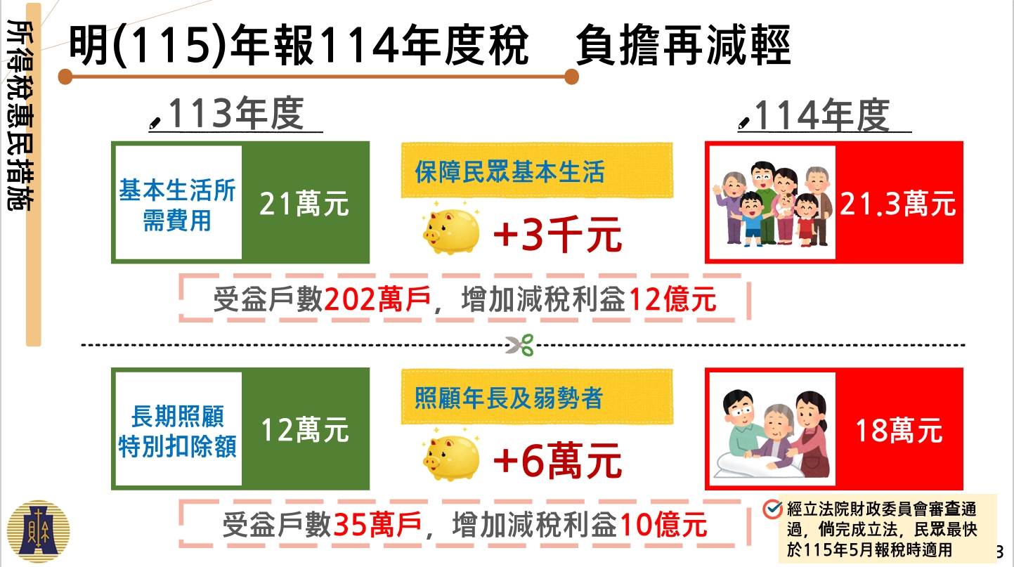 在「基本生活費」部分,將由每人21萬元提高至21.3萬元,估計約202萬戶受惠、減稅利益達12億元。此外,立法院三讀通過《所得稅法》修正案,將長照照顧扣除額由每人每年12萬元提高至18萬元,並追溯自2025年1月1日起實施,適用於2026年5月報稅。財政部估計約35萬戶受惠,整體減稅利益約10億元。