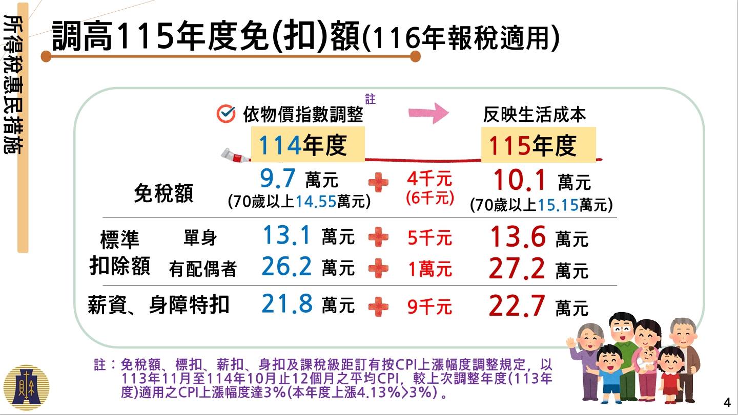 免稅額也同步調高至10.1萬元,較前一年度增加4,000元;70歲以上納稅人免稅額則提高至15.15萬元。扣除額方面,標準扣除額單身者調高至13.6萬元、增加5,000元;有配偶者則提高至27.2萬元、增加1萬元。薪資特別扣除額與身心障礙特別扣除額,也一併調整至22.7萬元,以更貼近實際生活支出。