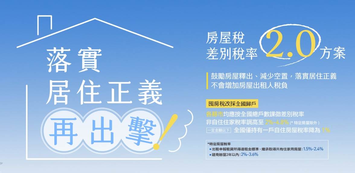 自住優惠重整:至於自住族群,若為全國單一自住且未超過各縣市豪宅線,可適用1%優惠稅率,多數自住房屋則適用1%或1.2%,財政部評估約99%自住房屋可享最低稅負。