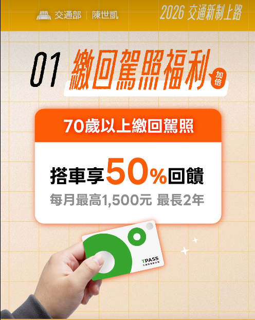 配合新制,交通部也同步推出誘因措施,年滿70歲者若自願繳回駕照並加入TPASS常客方案,可享公共運輸50%乘車回饋,每月上限1,500元,補助期間為2年,適用範圍涵蓋公車、捷運、台鐵、客運與計程車,盼在交通安全與長者行動需求間取得平衡。
