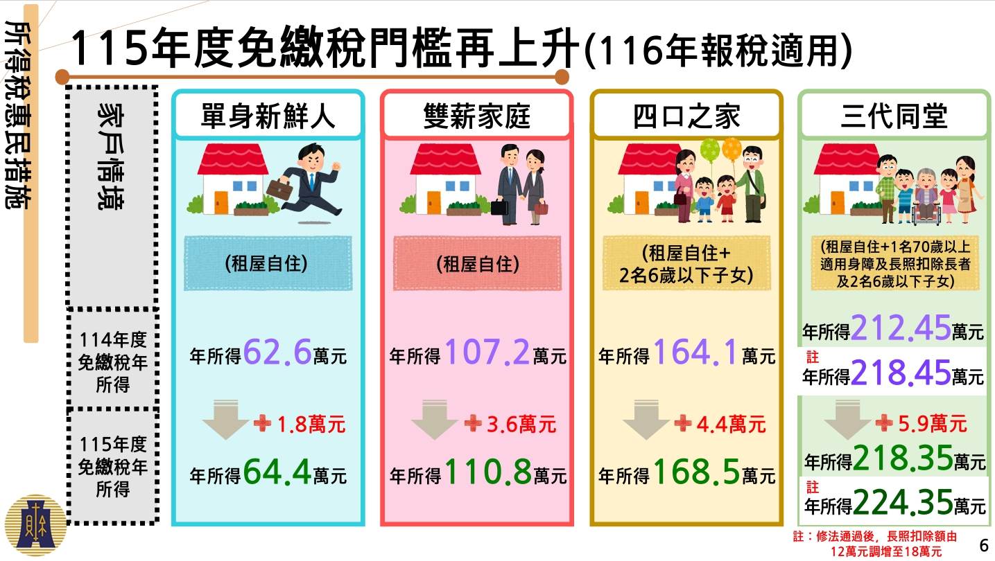行政院於2025年11月27日拍板多項綜合所得稅減稅措施,2026年報稅時(115年度)正式適用,此次調整重點放在反映物價上漲與生活成本變化,包含基本生活費、免稅額與各項扣除額全面上修,減輕民眾報稅負擔。