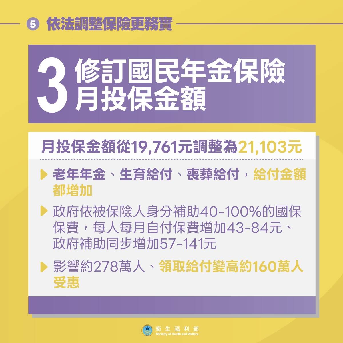 衛福部表示,此次調整屬制度性調整,目的在於反映物價變動,維持國民年金給付的實質保障功能。
