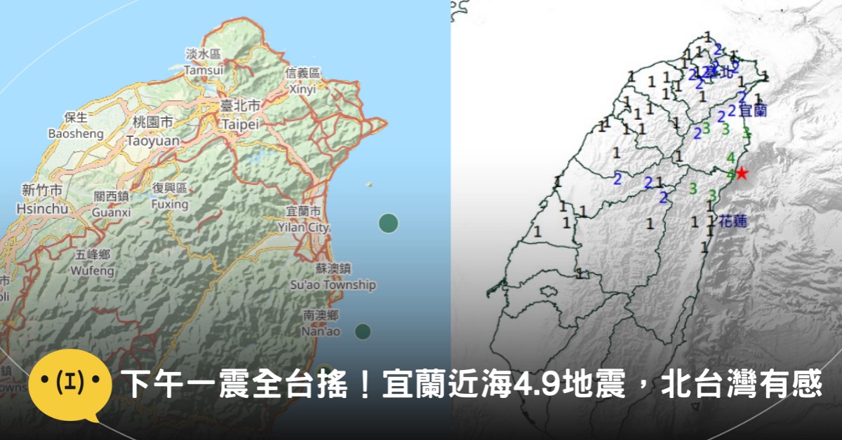 中央氣象署發布地震報告指出,今(18)日下午4時47分46秒,宜蘭縣近海發生有感地震,芮氏規模4.9,震源深度僅5.9公里,屬於極淺層地震,震央位於宜蘭縣政府南方約45.4公里處(北緯24.32度、東經121.81度),包括宜蘭、花蓮及北部多地均有明顯搖晃感受。