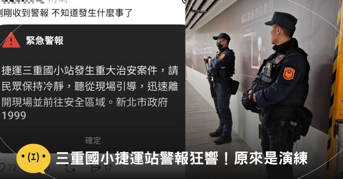 今日下午在新北市三重國小捷運站附近,許多民眾突收到手機跳出「緊急警報」簡訊,內容指稱「發生重大治安案件」,一度引起恐慌。幸好這只是一起防災演練,並非真實案件。