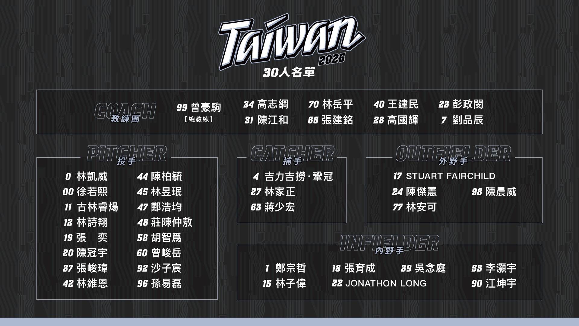 世界棒球經典賽(WBC)中華隊最終30人名單正式亮牌,台灣隊陣容也宣告成形;名單中首度迎來美籍戰力,包括台美混血的龍恩(Jonathon Long)與費爾柴德(Stuart Fairchild)備受關注。此外,名單還包含7位旅美球員、5位旅日球員、13位中職球員,以及目前無所屬球隊的捕手林家正,整體戰力配置完整。