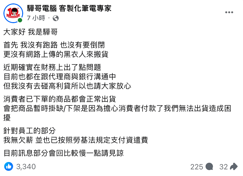 而今(7)日驊哥電腦臉書粉專終於更新,驊哥表示「確實在財務上出了點問題,目前也都在跟代理商與銀行溝通中」,至於消費者最關心的已下單商品都會正常出貨。