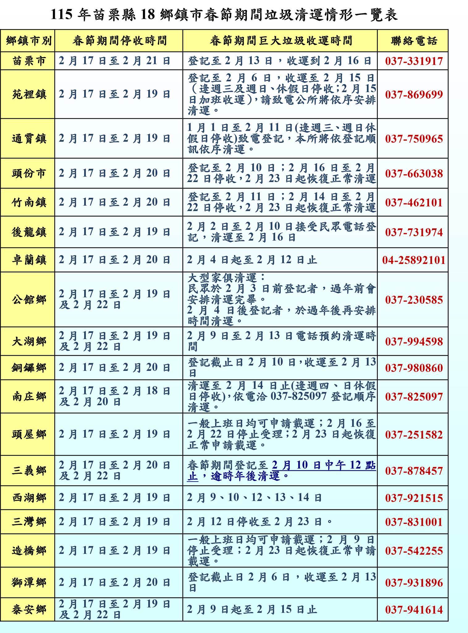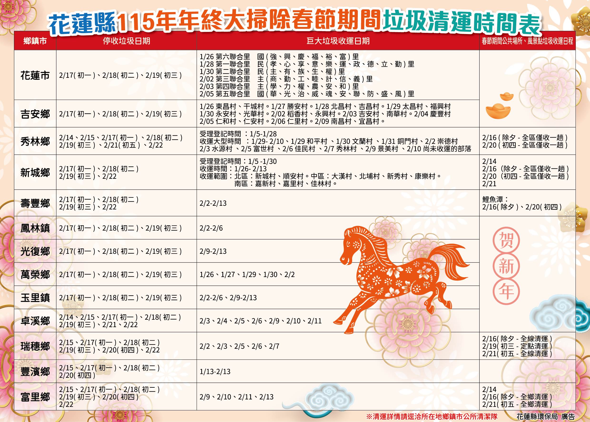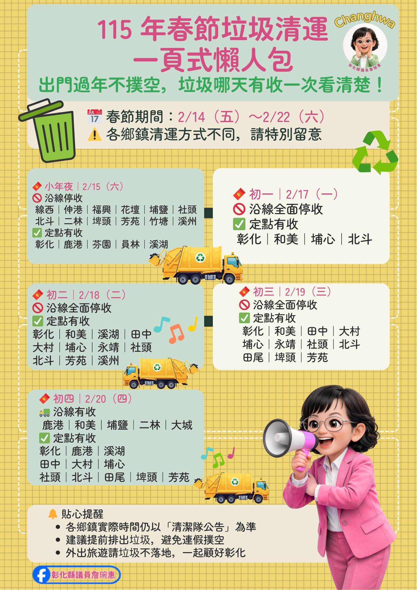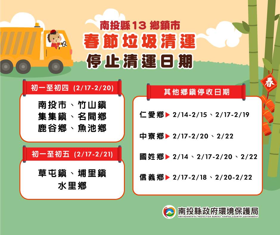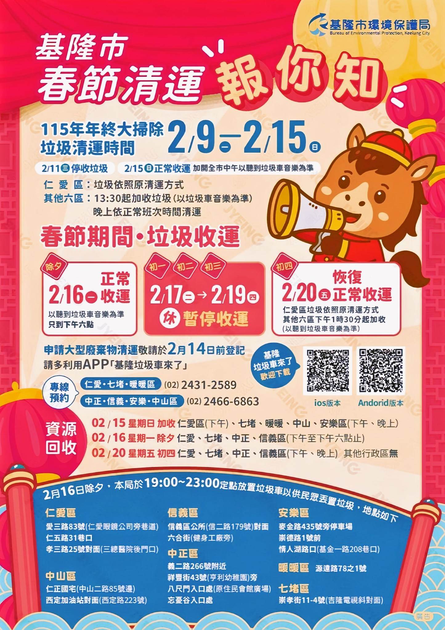 - 加班收運:2/14(六)依週六路線收運一趟、2/16(一)自上午8時起全區收運一趟、2/19(四)【初三】自上午8時起全區收運一趟、2/21(六)【初五】依週六路線收運一趟。