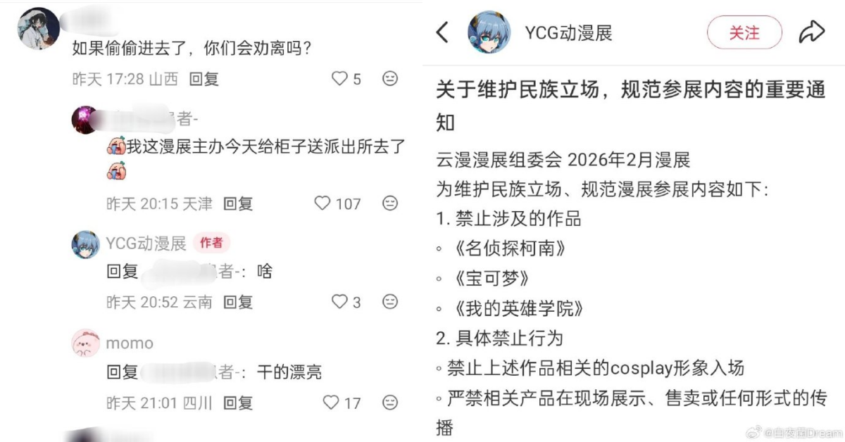 在官方論述發酵後,中國多個地區的動漫展陸續傳出禁止措施,不僅限制《寶可夢》、《名偵探柯南》角色COSPLAY,也同步禁止相關周邊商品販售,主辦單位對外說法多以「近期被認定傷害民族情感、違背歷史立場」作為理由。