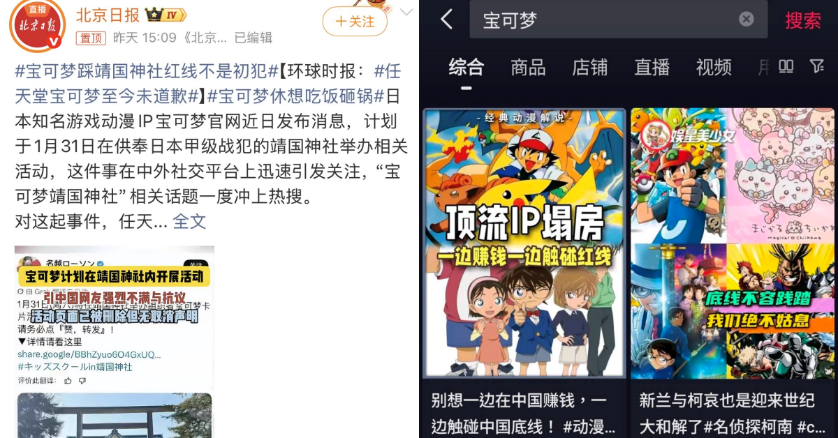 文章特別提到近期引發爭議的「寶可夢拜鬼事件」,指《寶可夢》曾在日本靖國神社相關場地舉辦卡牌教學活動,遭中方視為踩紅線;另外《名偵探柯南》與動畫作品《我的英雄學院》的聯動企劃,也被認為「違背歷史立場」,進而被貼上傷害民族情感的標籤。