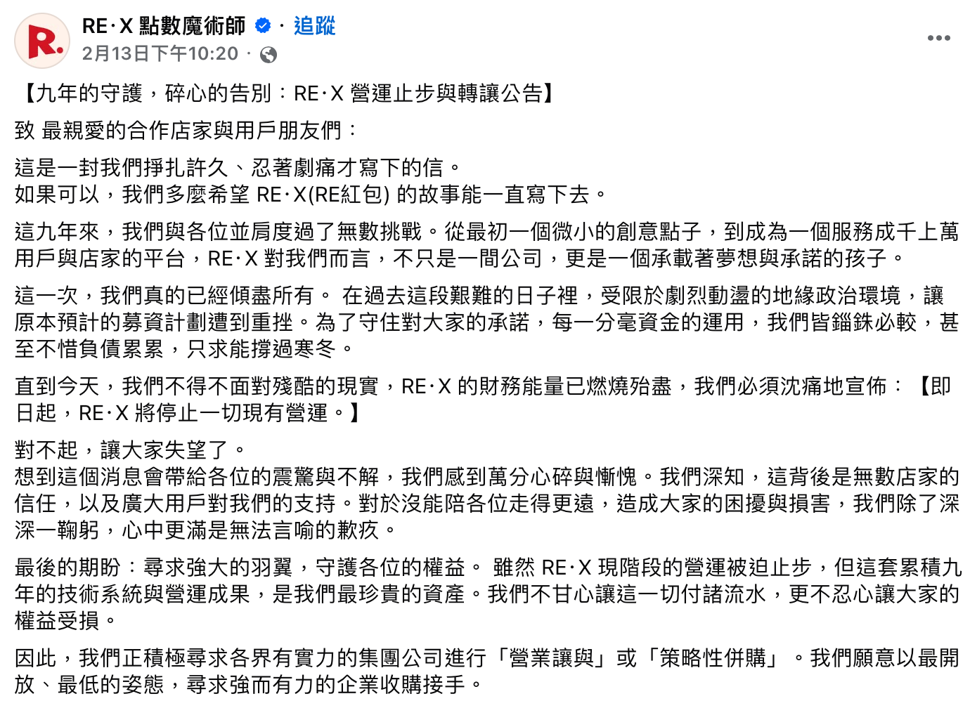 官方形容,團隊已「傾盡所有」,但仍難以抵擋現實壓力。同時,平台也表示,正積極尋求有實力的企業接手,無論是「營業讓與」或「策略性併購」,希望為平台與用戶尋找一線生機。