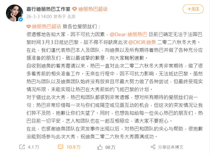 事發後,迪麗熱巴工作室於微博發布聲明,表示因「不可抗力因素」無法如期抵達巴黎,並向品牌方與期待已久的粉絲致歉。聲明中提到,迪麗熱巴對此次大秀十分重視,也提前做足準備,團隊與品牌方持續協調替代方案,但在現實情勢限制下仍無法成行,工作室同時強調,目前藝人與團隊互相照應,「一切平安」,請外界安心。