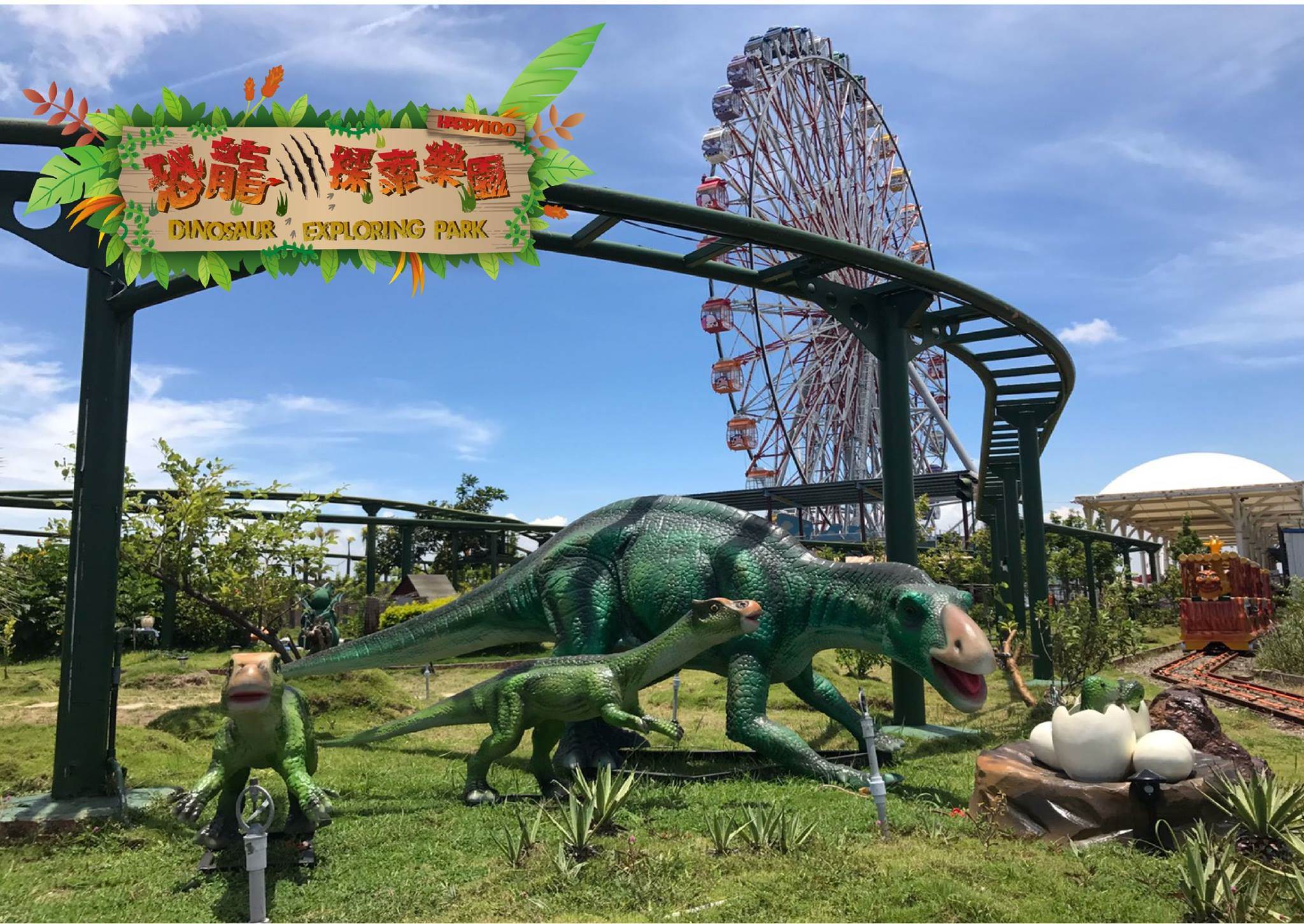 占地約2000坪的樂園,最大特色莫過於滿園的恐龍造景。園區最具代表性的地標,是一座高達6公尺的巨大暴龍模型,不只外型逼真,還能發出吼叫聲,經常吸引小朋友又驚又喜地圍觀拍照。園內總計設置22種不同恐龍,包括迅猛龍、腕龍等經典恐龍角色,部分模型還具備眨眼、擺尾等動態效果,讓整個園區彷彿變成一座迷你侏羅紀世界。