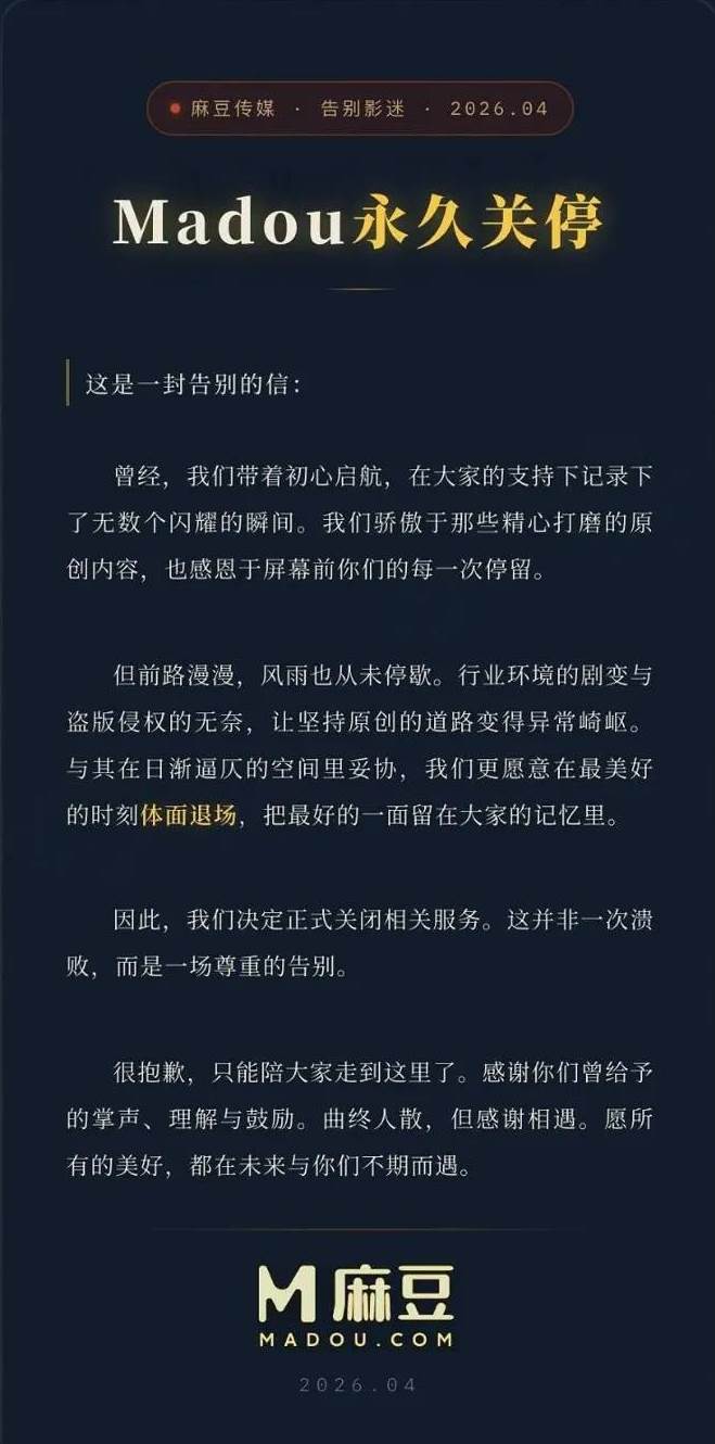 在內容產業快速更迭的時代,有些平台的存在,不只是娛樂選擇,更像是一段時期的縮影。近日,華語成人影視平台麻豆傳媒無預警宣布停止營運,震撼整個市場。這不只是一家公司關門,更像是一個產業階段的句點,也讓人開始重新思考:原創內容,在當今環境下究竟有多難生存?