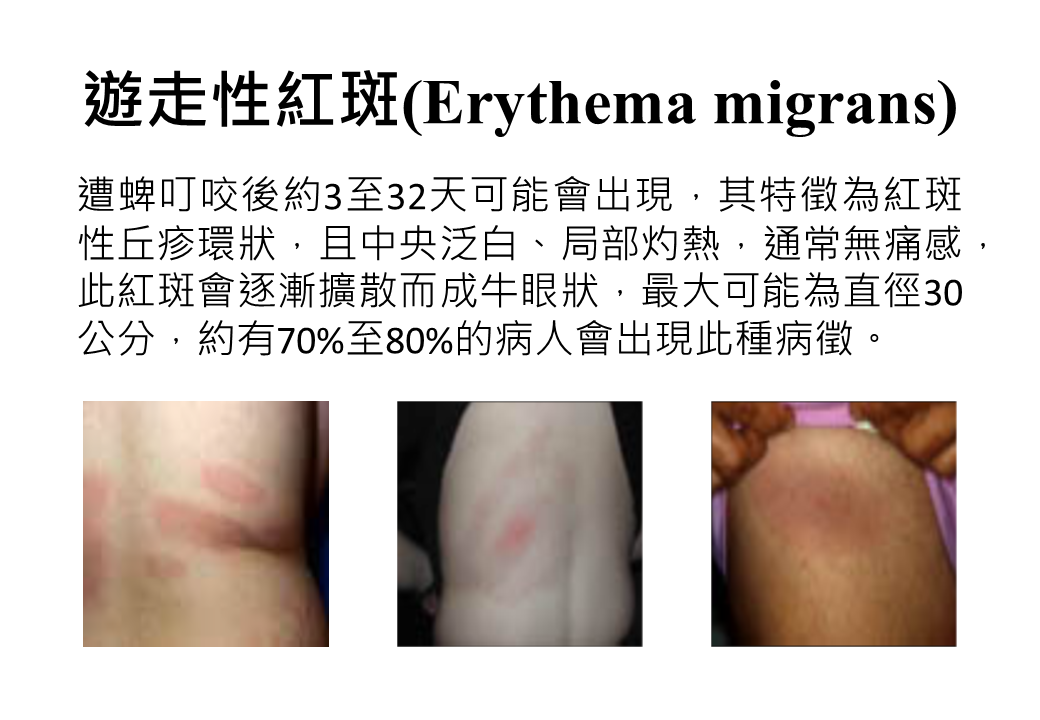 感染萊姆病後潛伏期約3至30天,多數患者初期會出現發燒、頭痛、疲倦、肌肉痠痛等類似感冒症狀,容易被忽略,不過約7至8成患者會出現典型「遊走性紅斑」,外觀呈現像靶心的紅疹,是判斷關鍵。若未及時治療,病菌可能侵犯關節、神經甚至心臟,嚴重時恐引發腦膜炎、心律不整等併發症,病程可能拖延數月甚至數年。