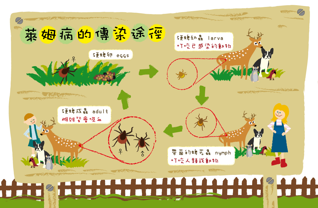 萊姆病屬於人畜共通傳染病,主要透過「硬蜱」(俗稱壁蝨)叮咬傳播,並不會人傳人,常見於森林、草叢等自然環境,也可能透過附著在寵物身上的蜱蟲間接接觸人體而感染。