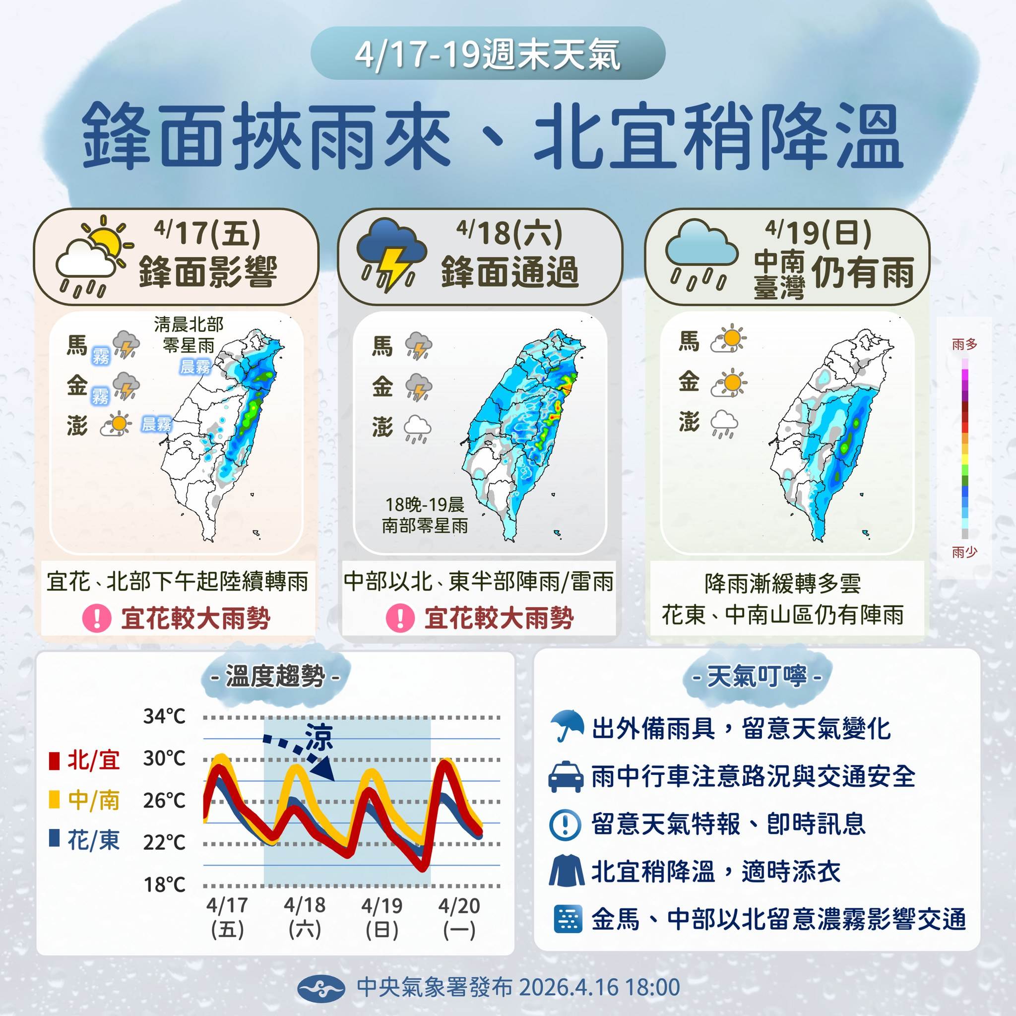氣象署說明,週六(18日)起鋒面通過,加上東北季風增強,天氣明顯轉差,降雨範圍涵蓋中部以北、東半部,甚至延伸到恆春半島與南部山區。北部、東北部氣溫也同步下滑,高溫降至約24至27度,低溫落在20至21度,明顯有「轉涼感」。