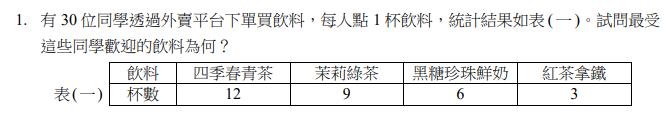 本次統測數A第一題,以30名學生透過外送平台點飲料,提供四種飲品與各自杯數,要求找出最受歡迎的選項,由於題幹清楚、數據一目了然,不少考生直言「一秒就能看出答案」,相關題目在社群平台迅速擴散,引起大量討論。