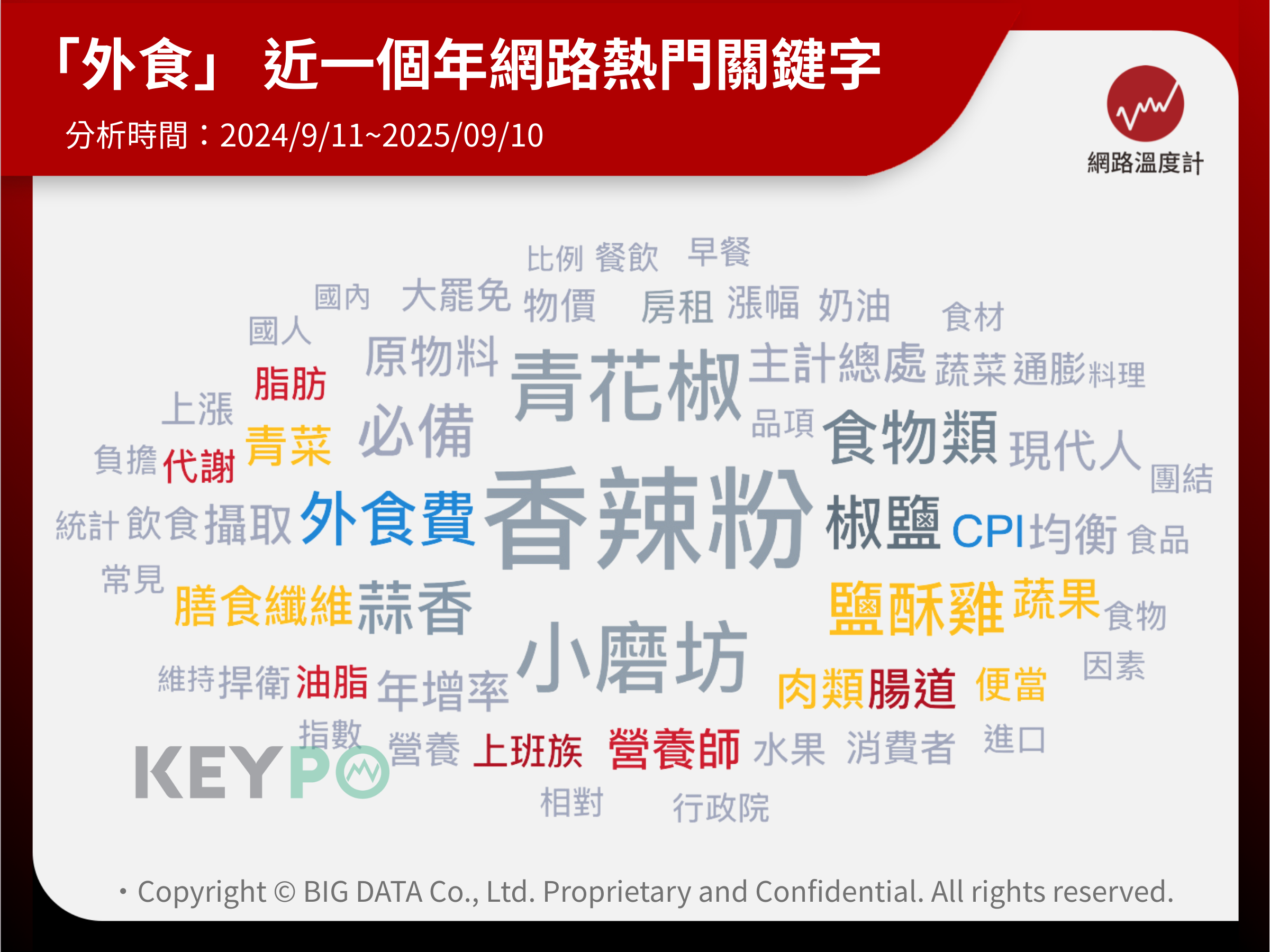 《網路溫度計DailyView》透過輿情分析軟體《KEYPO大數據關鍵引擎》,觀察近一年(2024/09/11–2025/09/10)關於「外食」網路討論達259,284筆,熱門關鍵字聚焦食材(例:鹽酥雞、便當、肉類、蔬果、青菜、膳食纖維),衍生出「上班族、營養師、脂肪、油脂、代謝、腸道、外食費、CPI(消費者物價指數)」等字詞。