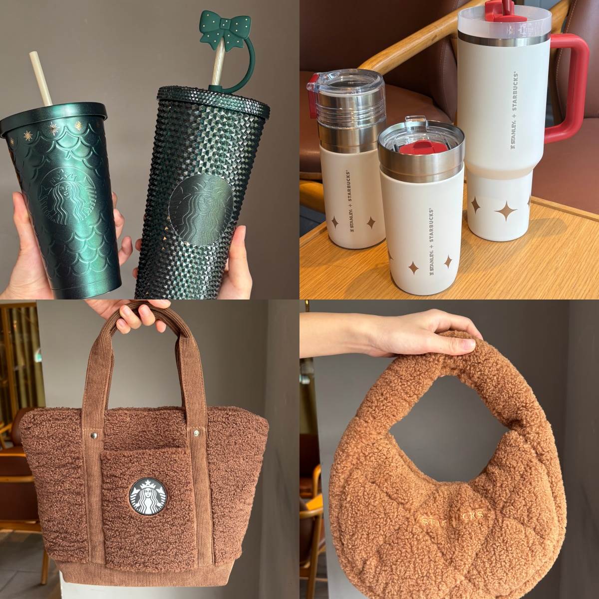今年杯款也超級吸睛,「薑餅屋系列」水彩風的薑餅人和小動物齊聚,童趣滿分;「緞帶系列」星星與蝴蝶結,氣質系朋友夢中聖誕杯;而「金綠品牌色系列」綠色天鵝絨+金色細節,像端著一杯聖誕晚宴。此外,星巴克還推出與STANLEY聯名的香檳金、夢幻紫TOGO冷水杯,以及會bling bling閃亮的金綠配色冷水杯,搭配薑餅人吸管套,而蓬鬆的女神絨毛系列包款也很吸睛,整套帶出門真的會讓人以為你在拍耶誕節特輯。