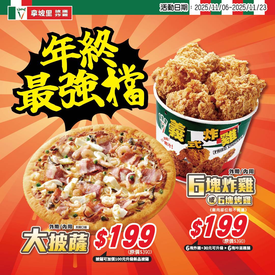 必勝客即日起至11/30,祭出極度狂妄的「買大送大,再送副食飲料」,也就是嚴格來說是買1送3。外送也同步升級成買大送大,不用出門也能吃得很豪氣。不僅如此,多款大披薩限時只要199元,還能免費升級薄脆餅皮。經典組合如「四小福+日式照燒雞」或「四小福+熱帶鳳梨海鮮總匯」,一年僅此一次的價格別錯過;個人比薩也推出買1送1,還有「三個199元」的超值版本,完全讓人必勝客吃到變常客。