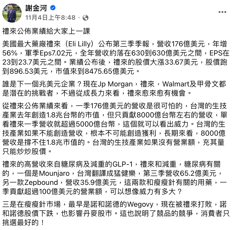在市場競爭上,原本由諾和諾德的「Wegovy」領跑,但如今禮來的猛健樂成功逆轉勝,甚至帶動丹麥股市震盪,謝金河形容:「消費者只挑最好的!」從藥效、品牌到市場策略,禮來的強勢崛起幾乎改寫整個產業版圖。從百年前的胰島素到今天的瘦瘦筆,禮來再度證明老字號藥廠也能年輕。根據分析師預測,禮來極有可能成為下一家「兆美元企業」,和蘋果、微軟齊名。而對台灣生技產業來說,禮來的故事也像一堂現實課:真正的價值,不在炒股,而在研發。