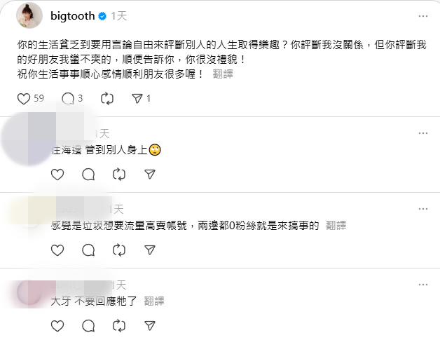 此外也有人透過Threads不滿她過去高調放閃如今卻離婚:「當初那麼高調說感情多好,根本在自打嘴巴」、「真諷刺當初還高調說感情多好如今離婚不勝唏噓,早知如此何必當初」,大牙甚至遭到網友標記,而她對此也不甘示弱強硬回應:「你有什麼毛病我就問?」、「關你個屁事?!」、「你的生活貧乏到要用言論自由來評斷別人的人生取得樂趣?你評斷我沒關係,但你評斷我的好朋友我滿不爽的,順便告訴你,你很沒禮貌」,對於不認同的言論直言回擊。