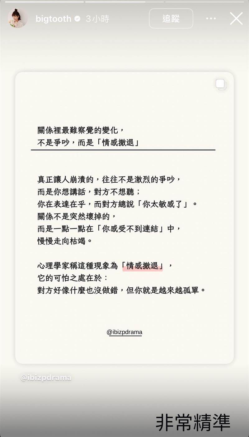 大牙近日曾於深夜轉發文章吐心境:「關係裡最難察覺的變化,不是爭吵,而是『情感撤退』,真正讓人崩潰的,往往不是激烈爭吵,而是你想講話,對方不想聽」,認為情感撤退可怕之處在於,對方好像什麼也沒做錯,但你就是越來越孤單」,對於文章內容表示「非常精準」,似乎很有共鳴。